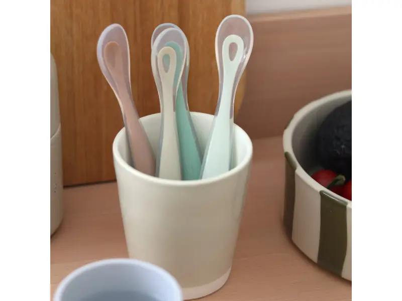 Silikónové lyžičky pre najmenších sú šetrné k citlivým detským ďasnám a navrhnuté pre hladký prechod z cumlíka na lyžičku. Dlhá rukoväť uľahčuje rodičovi naberanie z misky aj pohára bez zašpinenia rúk.