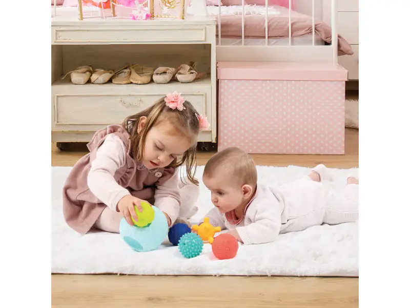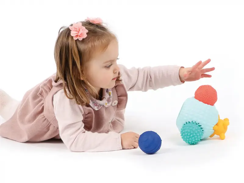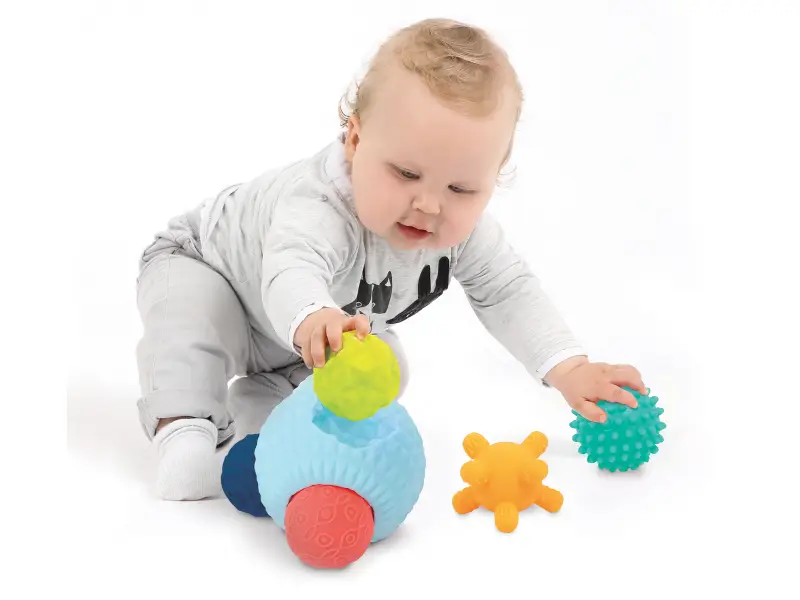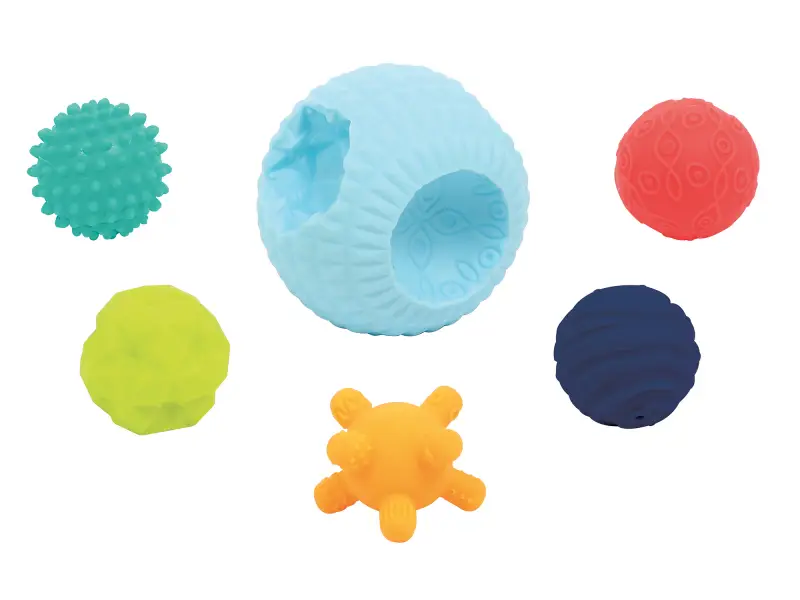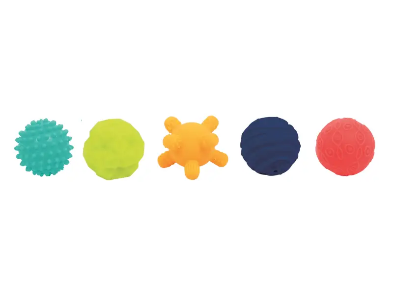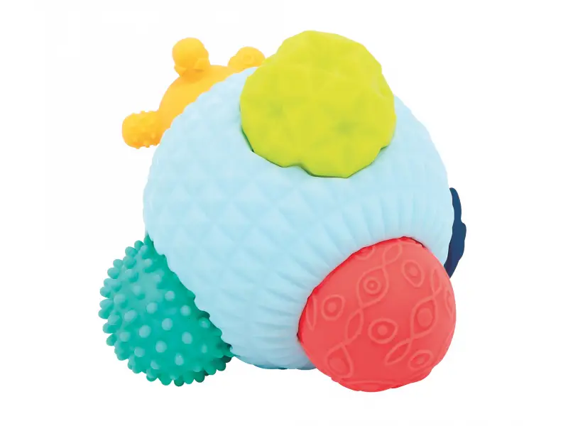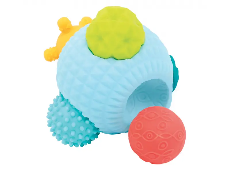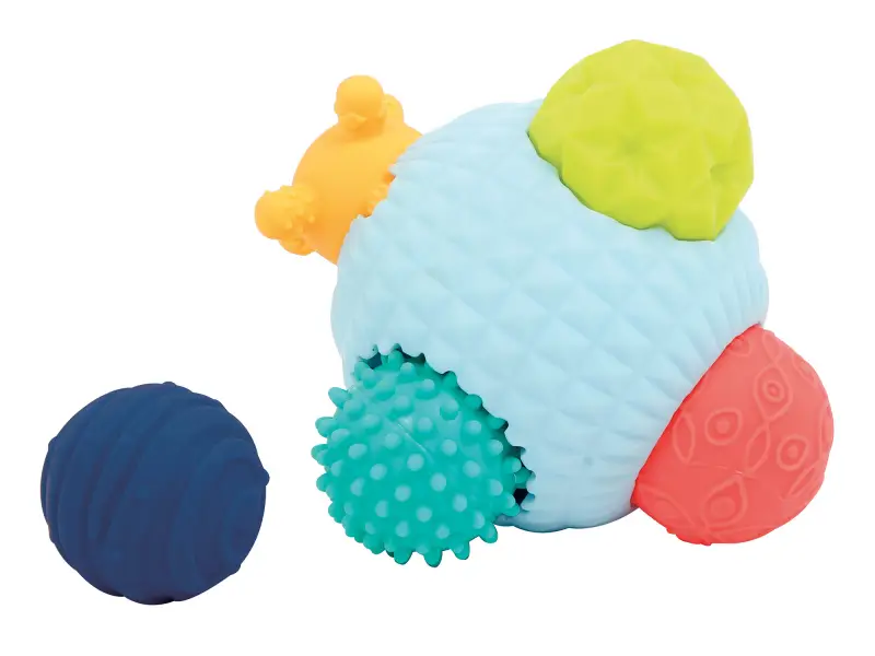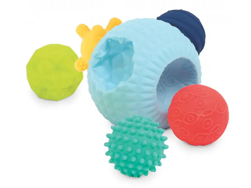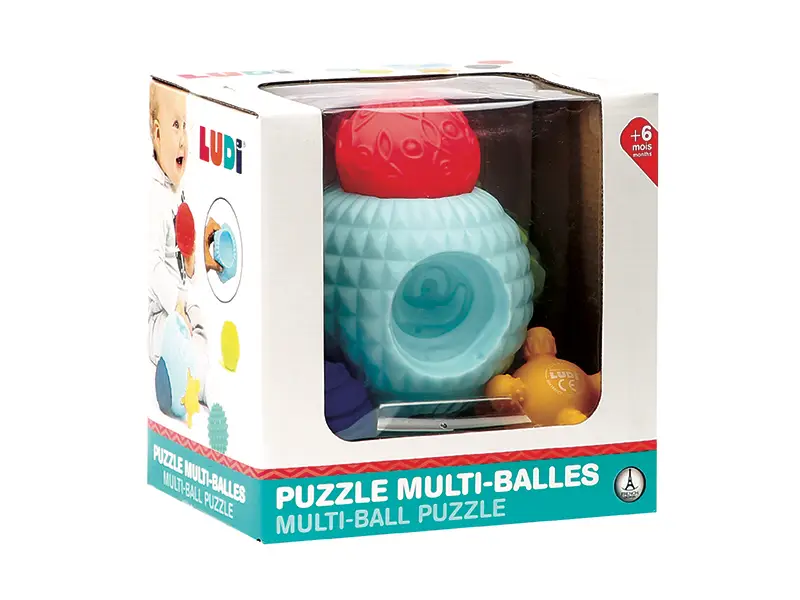 3D puzzle z loptičiek tvorí jednu veľkú loptičku s otvormi a 5 menších loptičiek s rôznorodými textúrami. Loptičky, ktoré sa líšia farbou, veľkosťou i povrchom povzbudzujú detskú zvedavosť a lákajú na skúmanie. Každá loptička pasuje do jedného z piatich otvorov vo veľkej loptičke. Deti budú nadšene malé loptičky z otvorov vyťahovať a potom sa snažiť ich vrátiť na svoje miesto.