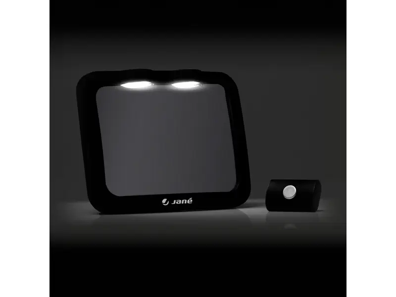 Zrkadlo s dvojitým LED osvietením a diaľkovým ovládaním pre monitorovanie dieťaťa sediaceho v autosedačke proti smeru jazdy na zadnom sedadle. Otočný ohybný mechanizmus umožnňuje nastavenie ideálneho zorného uhla. LED osvietenie sa rozsvecuje pomocou diaľkového ovládania pomaly a postupne, aby vaše dieťa nerušilo.